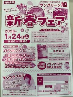 新春フェア開催!! 日頃より、サングリーン旭をご利用いただきありがとうございます。 今年度のサングリーン旭、初イベント『新春フェア」を1月24日(土)【9:00~15:00】に開催いたします。 恒例のガラポンくじ・タイムサービス。 また、🎤マシコタツロウさんのスペシャルライブ🎤を行います。 1月24日(土)は、是非!サングリーン旭までお越しください。 スタッフ一同、お待ちしております。 ※当日、悪天候等により、イベント内容が変更になる場合もございます。
