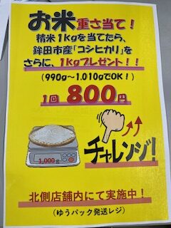お米イベント!! 日頃より、サングリーン旭をご利用いただきありがとうございます。 令和7年度 鉾田市産「コシヒカリ」の重さ(1kg)を当てて、さらに1kgをプレゼントいたします。 この機会に、是非!チャレンジしてみては... (無くなり次第、このイベントは終了致しますので、ご了承ください)